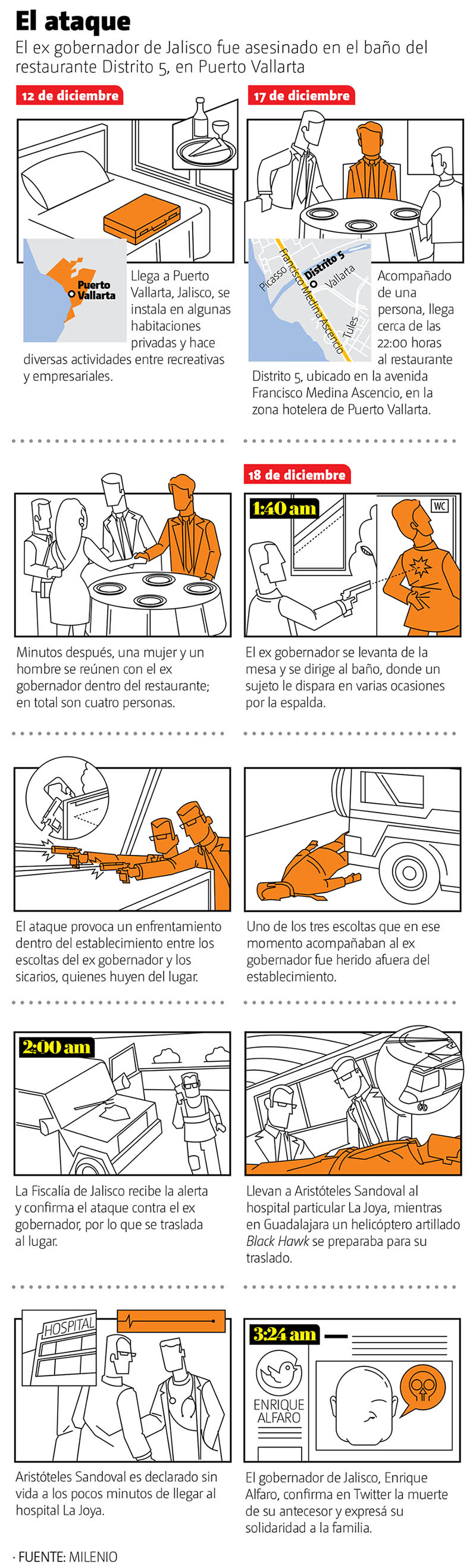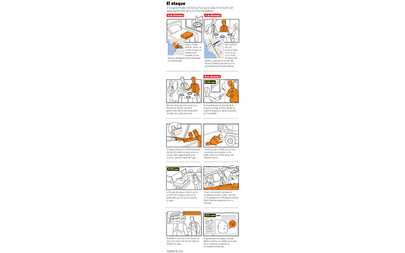 De acuerdo con las indagatorias de la Fiscalía General del Estado, el ex mandatario arribó al lugar pasadas las 10 de la noche del jueves para encontrarse con dos personas, con quienes departió. Luego de la una de la mañana del viernes fue ejecutado, mientras tres de sus escoltas permanecían afuera “por instrucciones” del priista.