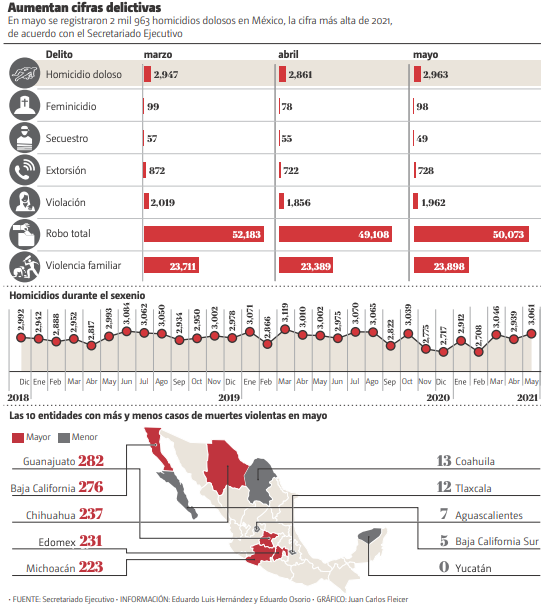 En tanto, de enero a mayo de 2021 van 14 mil 666 ejecuciones, una disminución de 2.6 por ciento respecto al mismo periodo de 2020, cuando hubo 15 mil 68.