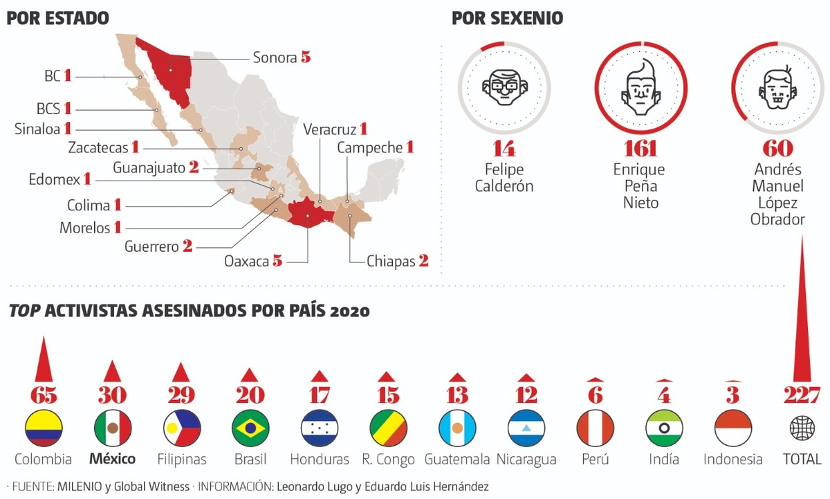 Durante el 2021, en México fueron asesinados 25 activistas defensores de derechos humanos y del medio ambiente; ultimatos que fueron realizados en Baja California, Baja California Sur, Campeche, Chiapas, Colima, Guerrero, Guanajuato, Morelos, Oaxaca, Sonora, Sinaloa, Zacatecas y Veracruz, donde los activistas salvaguardaban los derechos humanos de las comunidades que habitaban.