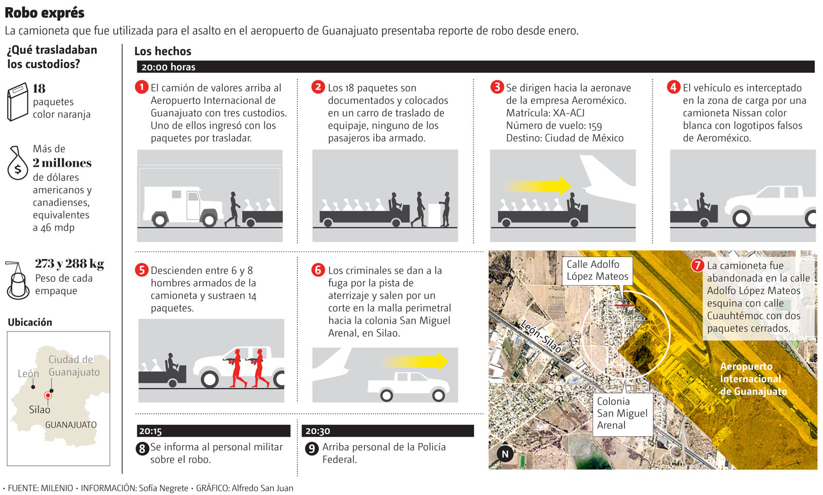 MILENIO confirmó que el vehículo con el dinero inició el trayecto rumbo al avión con matrícula XA-ACJ, vuelo 59 con destino a la Ciudad de México, cuando una camioneta Nissan blanca, con logotipos de la empresa Aeroméxico, los interceptó.
