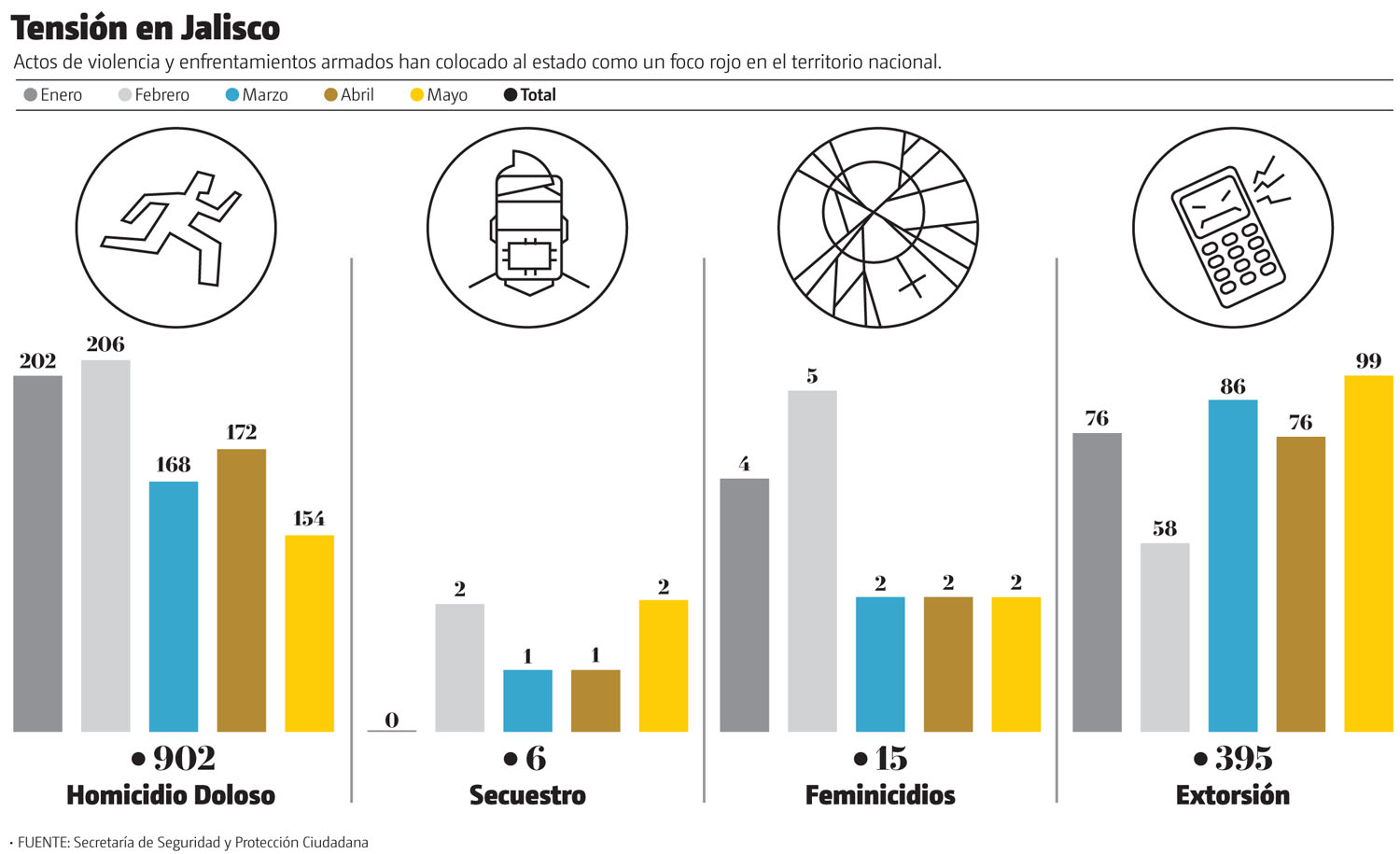 Con los ataques de Jalisco y Sonora, el recuento de violencia alcanzó los 26 muertos en seis estados, de los cuales 9 se perpetraron en Chihuahua; cinco, en Oaxaca; cuatro, en Guerrero; uno, en Coahuila, al igual que en Puebla.