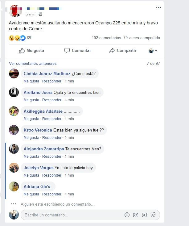 La propietaria del negocio señaló a las autoridades que había sido víctima de robo con violencia por parte de un hombre que ingresó armado al lugar y que además, la había obligado a encerrarse en un compartimento del local, desde donde pidió ayuda por medio de su cuenta en Facebook.