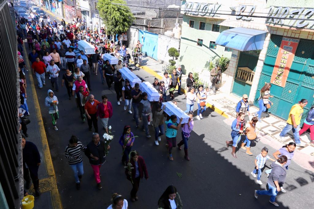 Después de velar a los niños que murieron al incendiarse su casa en Iztapalapa, los siete féretros blancos fueron llevados a la iglesia del pueblo de Santa Cruz Meyehualco, para celebrar una ceremonia religiosa de cuerpo presente.