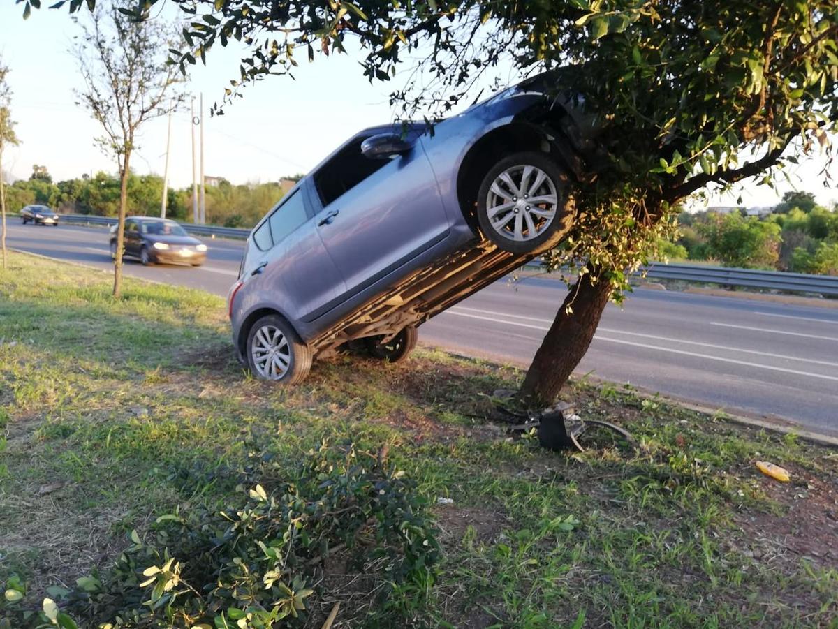 Un auto se impactó contra un árbol y subió a él tras perder el control del volante en la avenida Morones Prieto, a la altura de la calle Guerrero, frente a la colonia Benito Juárez, en Guadalupe, Nuevo León.