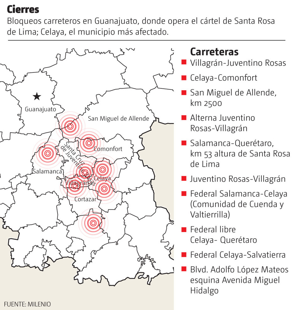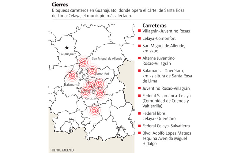 Uno de los municipios más afectados por la quema de unidades fue Celaya, principalmente la carretera a Salamanca, la salida a Querétaro, al igual que en la autopista Celaya-Querétaro y la vialidad de Juventino Rosas.