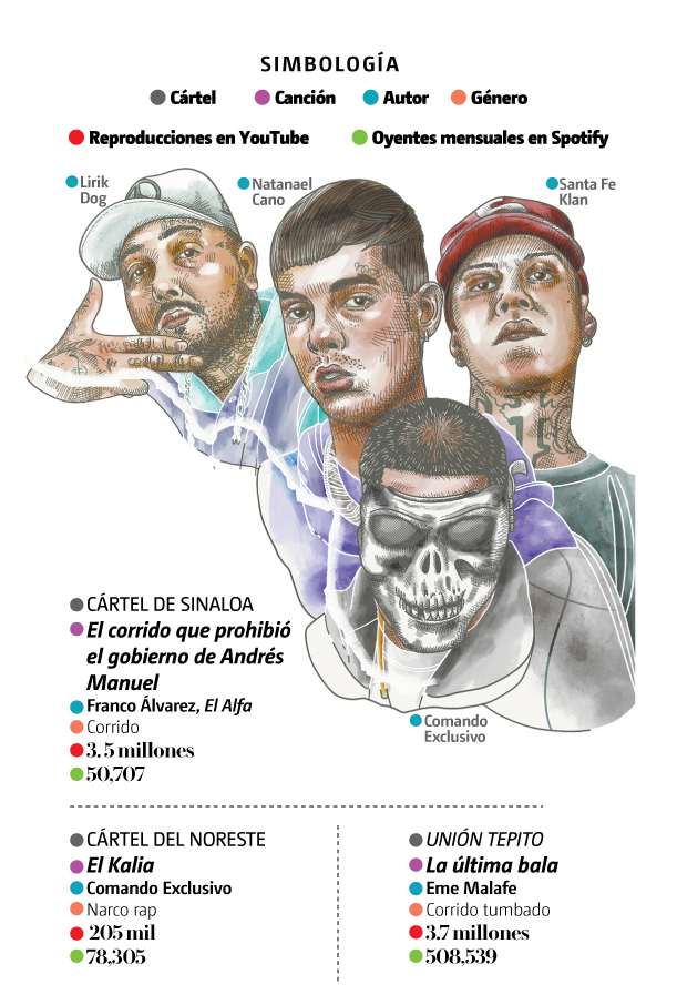 La guerra contra las drogas está en Spotify, Apple, Amazon o Youtube, donde las organizaciones criminales encontraron un aparador para ofrecer droga auditiva: nuevos géneros y exponentes con listas de reproducción cargadas de pólvora, ‘mota’ y ‘polvo del que aliviana’; con visitas que se cuentan por millones y ganancias que llegan a México en forma de dólares.