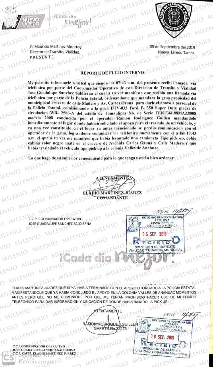 Ese día por la mañana, de acuerdo con el parte del chofer, del cual MILENIO tiene copia, Eladio Martínez, comandante del área de grúas de Nuevo Laredo recibió una llamada en la que se le ordenó enviar una unidad a la calle de Francisco I. Madero casi esquina con Carlos Osuna.