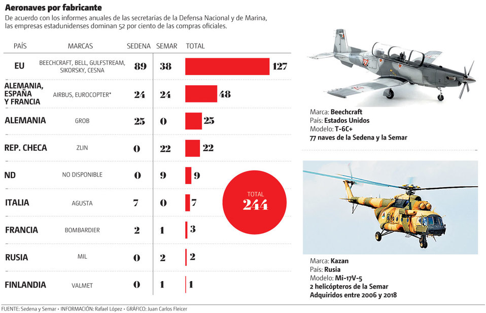 Entre 2012 y 2018, la Defensa compró 147 aeronaves y la Armada se hizo de 97, y en esas operaciones las dependencias militares privilegiaron la adquisición de aeronaves fabricadas en EU y diversos países europeos.