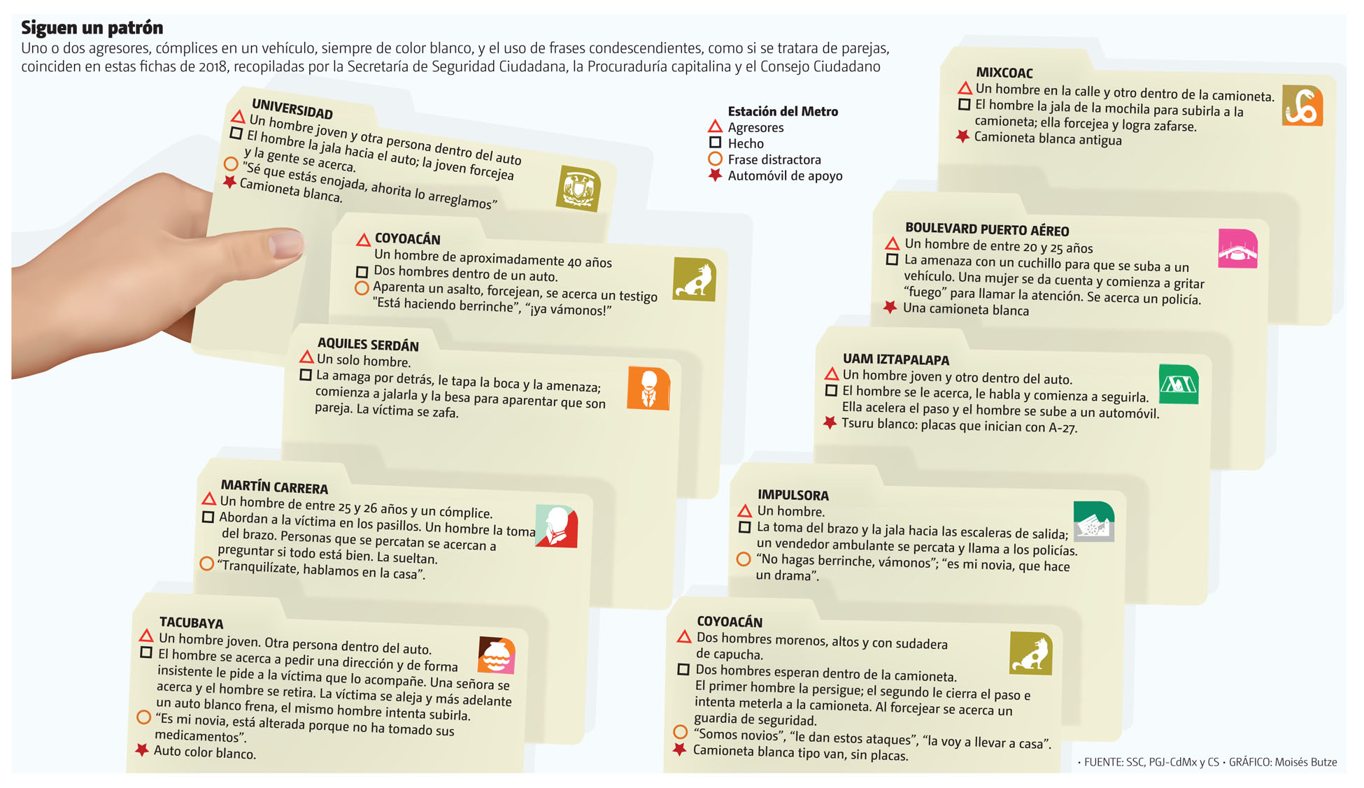 En enero de 2019 se tienen georreferenciados 15 casos dentro o en inmediaciones de las estaciones Universidad, Coyoacán, Canal del Norte, Tacubaya, Martín Carrera, Aquiles Serdán, Mixcoac, Chabacano, Bulevar Puerto Aéreo, Atlalilco, UAM Iztapalapa e Impulsora, principalmente.