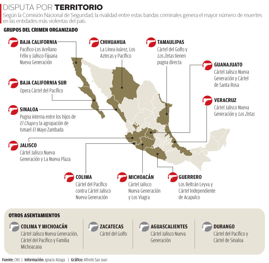 La Defensa Nacional señala que en Colima operan el CJNG, el Cártel de Sinaloa y La Familia michoacana, en tanto que existe una cruenta pugna entre las dos primeras organizaciones criminales.