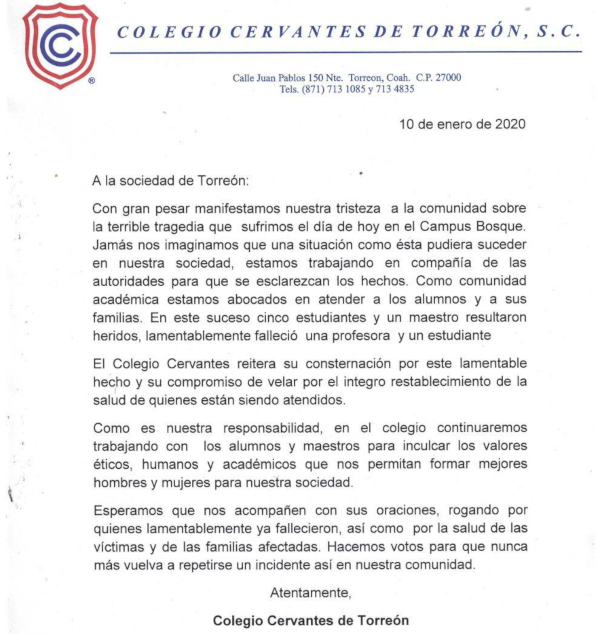 Tras el tiroteo, el Colegio Cervantes de Torreón el director de plantel, Jaime Méndez Vigata, leyó un comunicado en el que lamentó los hechos.