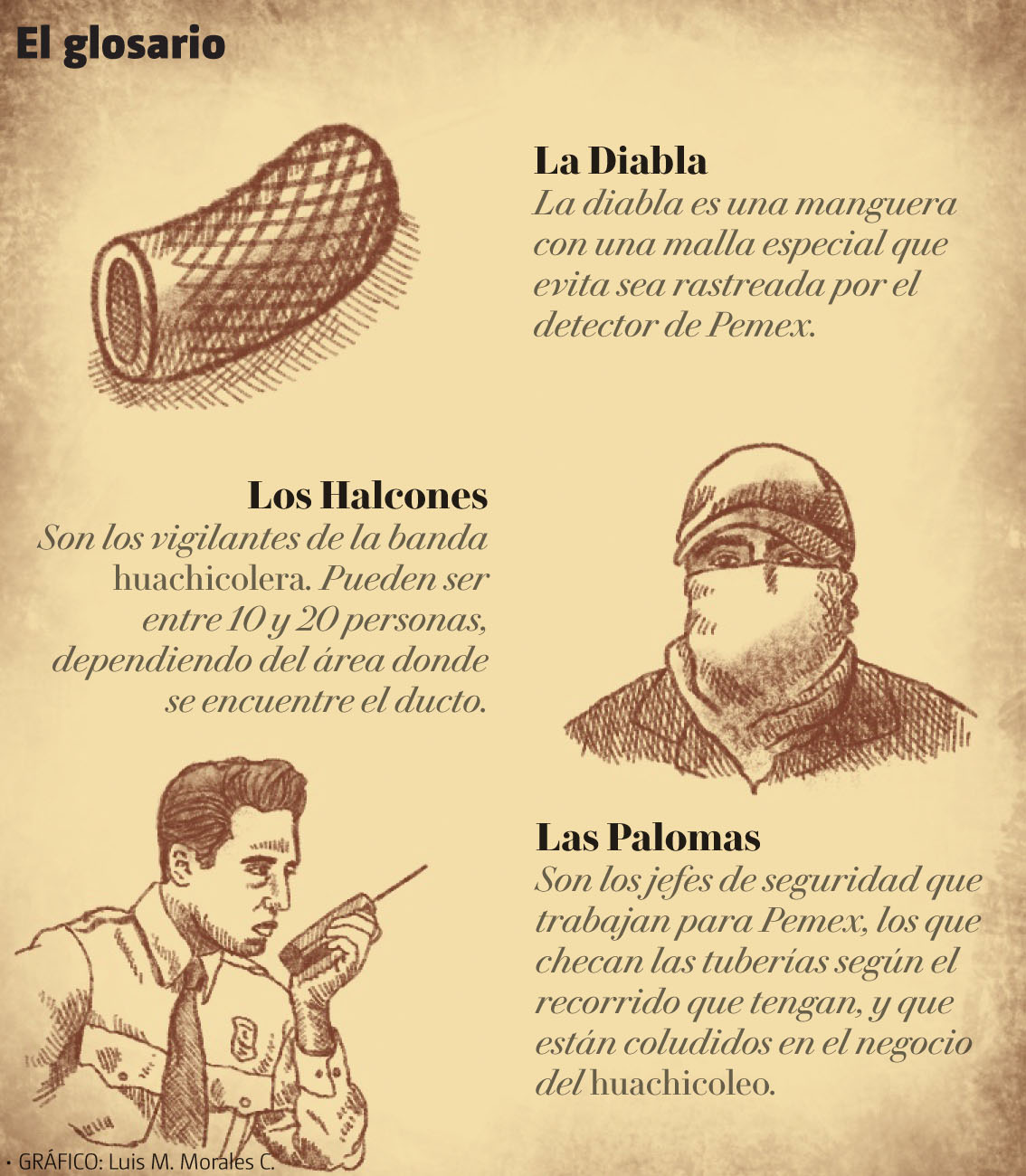 Un antiguo miembro de Los Zetas del norte de México se convirtió en los últimos seis años en huachicolero del centro del país. De ser soldado del narcotráfico pasó a ser un obrero especializado en una actividad ilegal que requiere tantas habilidades mafiosas como de ingeniería y donde el término huachicol forma parte de una jerga más amplia, con palabras igual de clave como La Niña, La Diabla, Los Halcones y Las Palomas.