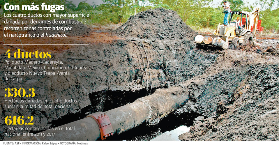 Por fugas en estructuras de Petróleos Mexicanos (Pemex) existen en el país 4 mil 509 sitios contaminados, la mitad de los cuales se debe a fallas en cuatro ductos que recorren distintas zonas donde operan grupos del huachicol y el narcotráfico.