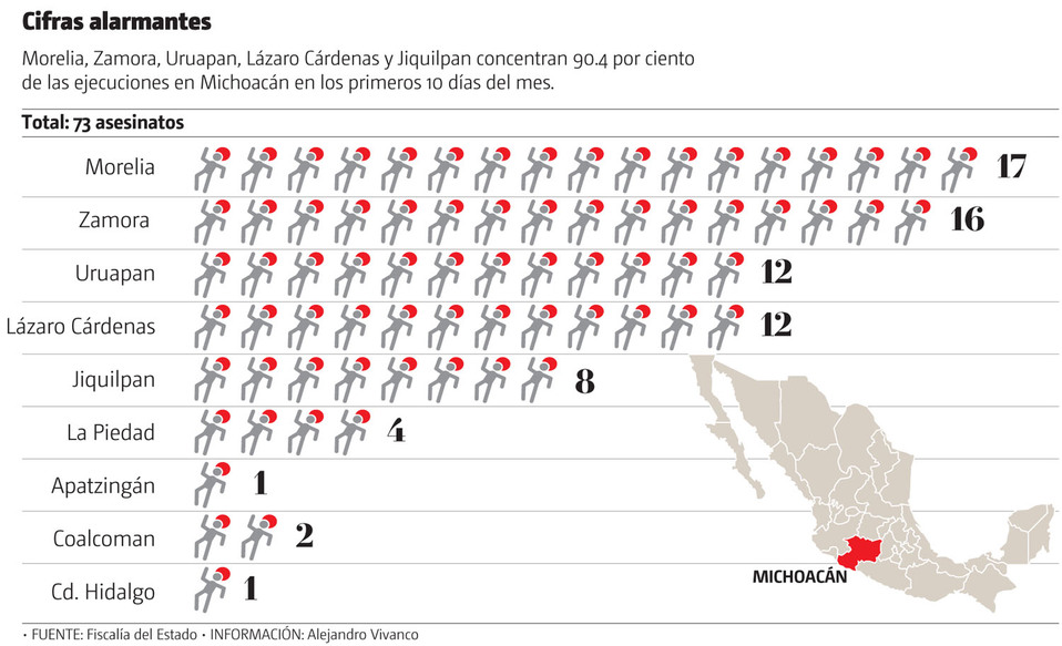 En los primeros 10 días de septiembre se han perpetrado 73 homicidios dolosos en Michoacán, un promedio de siete asesinatos al día.
