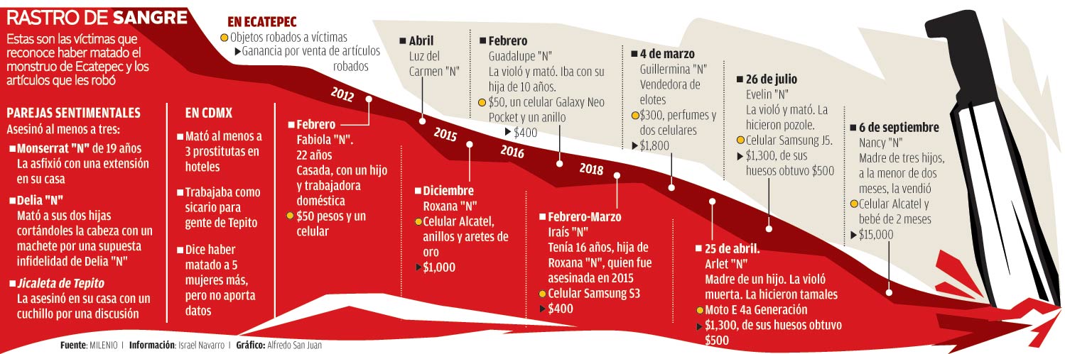 Estamos viviendo en el país una ola de violencia muy clara, todos nos damos cuenta, no es privativo del Estado de México, pero este caso en particular no lo podemos atribuir a esta ola de violencia, este caso comenzó en 2012. Él señala dos eventos traumáticos que, a decir de él, son la causa: uno es el rencor contra su madre, que al parecer engañaba a su padre y obligaba al niño a observar cuando tenía relaciones sexuales con otros hombres, y el caso de una muchacha con la que tenía una relación sentimental, ella desapareció y eso le provocó odio a las mujeres. Así lo señala él puntualmente: “Tengo odio contra todas las mujeres”.