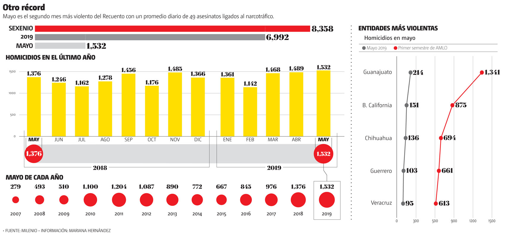 Pese a que hubo una ligera disminución de homicidios en diciembre y enero, este año cada mes se ha impuesto un nuevo récord: 2019 suma ya un total de 6 mil 992 víctimas y mayo se colocó como el segundo mes más violento, con mil 532 muertes a causa de ajustes de cuentas, balaceras, poder territorial entre cárteles y enfrentamientos entre narcomenudistas.