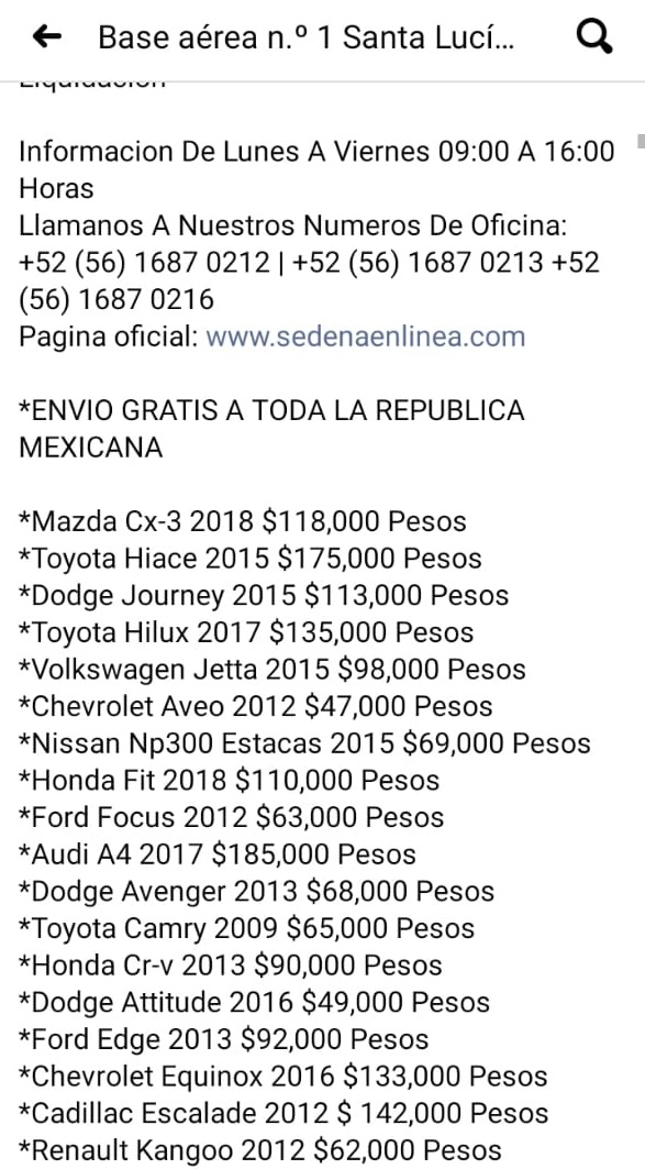 La Secretaría de la Defensa Nacional (Sedena) alertó que es falsa la información difundida en redes sociales respecto al “remate” de vehículos seminuevos de "uso ejecutivo militar" en instalaciones de la Base Aérea de Santa Lucía, Estado de México.