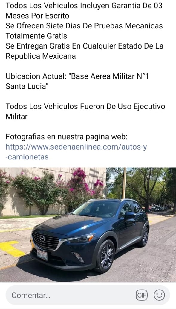 Para enganchar a posibles víctimas colgaron el siguiente anuncio: “La Secretaría de la Defensa Nacional Remata Vehículos Seminuevos en Excelentes Condiciones. Unidades Certificadas con Precios de Liquidación”.