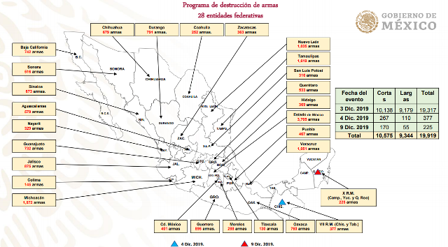 El titular de la Secretaría de la Defensa Nacional (Sedena), Luis Cresencio Sandoval, informó que hasta ayer se destruyeron 19 mil 317 armas decomisadas en 26 estados del país, y estimó que la próxima semana el número ascenderá a 19 mil 919.