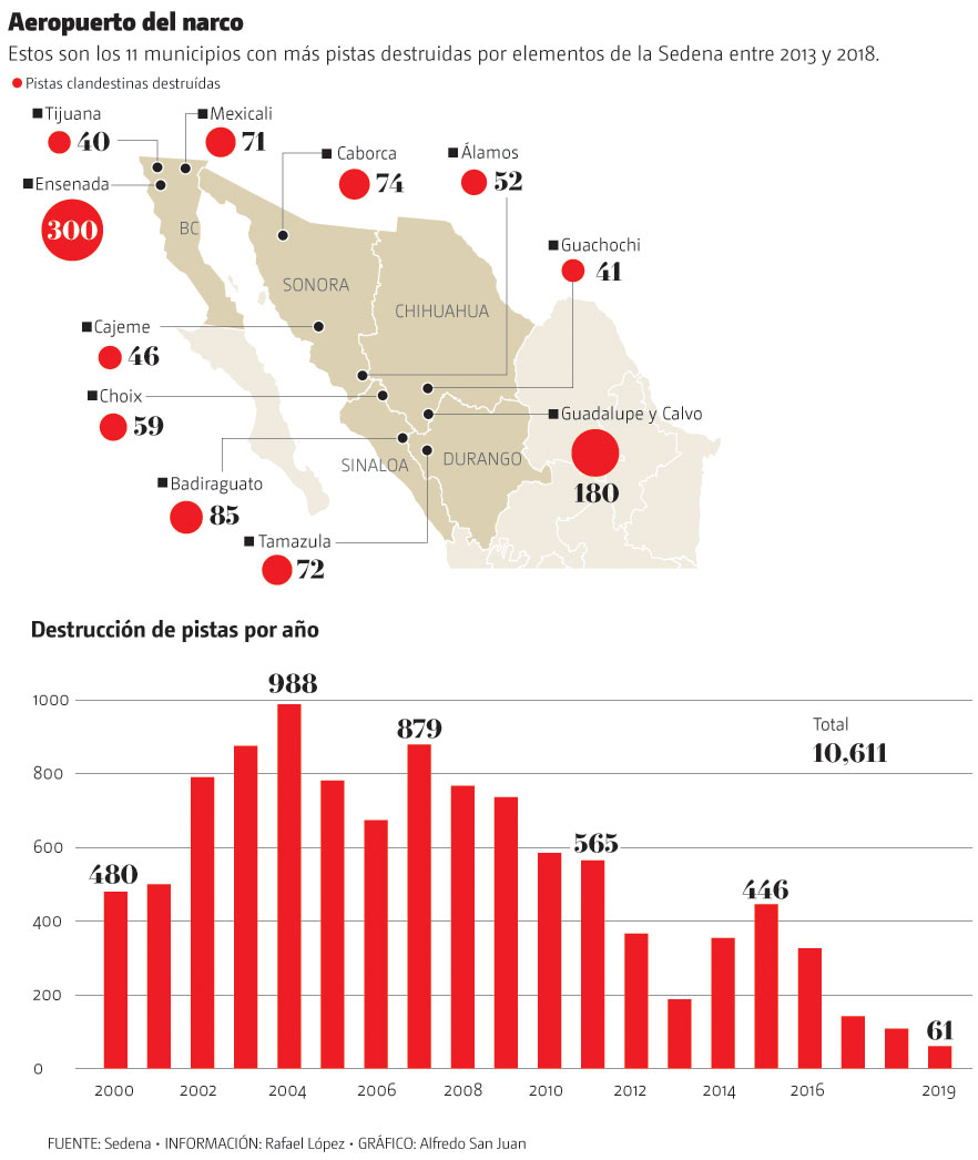 Las cifras revelan que en la primera década de este siglo se destruyeron 7 mil 470 pistas clandestinas, mientras que entre 2010 y 2019 se logró sacar de operación 3 mil 141 campos de aterrizaje, de acuerdo con datos proporcionados por la Defensa Nacional mediante una solicitud de transparencia.