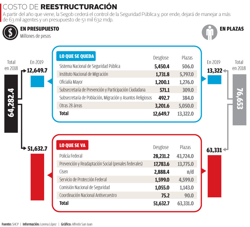 Con la anunciada creación de la Secretaría de Seguridad Pública, que durante el próximo gobierno de Andrés Manuel López Obrador será encabezada por Alfonso Durazo, Gobernación perderá sus atribuciones en materia de seguridad y se reorganizará al quedarse con 17.49 por ciento de las plazas y aproximadamente una tercera parte de su presupuesto.