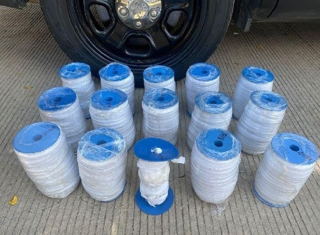 La segunda caja tenía 15 rollos de resorte, donde localizaron una bolsa de plástico que tenía en su interior otros cuatro kilogramos de la misma sustancia blanca y cristalina.