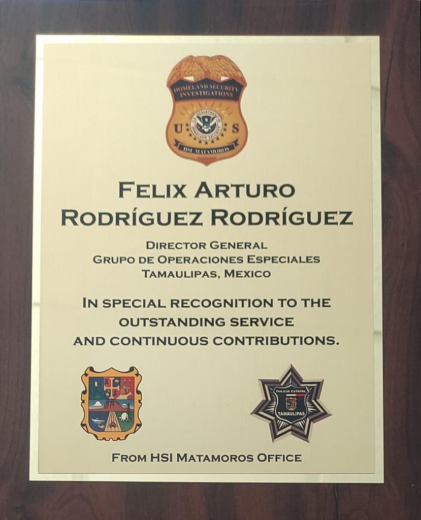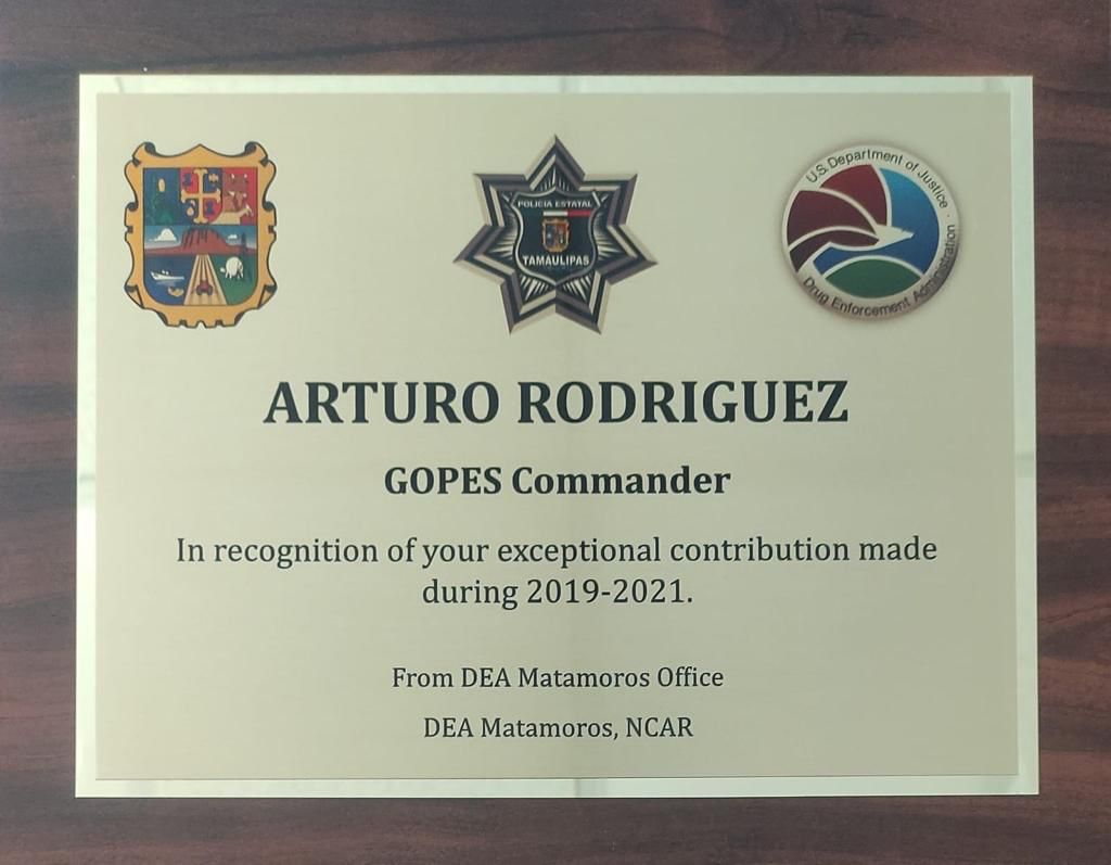 Las Oficinas de la Administración para el Control de las Drogas (DEA, por sus siglas en inglés) y de Investigaciones en Seguridad Nacional (HSI), en el Consulado de Matamoros, otorgaron un reconocimiento al Director del Grupo de Operaciones Especiales (GOPES)de la Policía Estatal de Tamaulipas, Arturo Rodríguez Rodríguez.