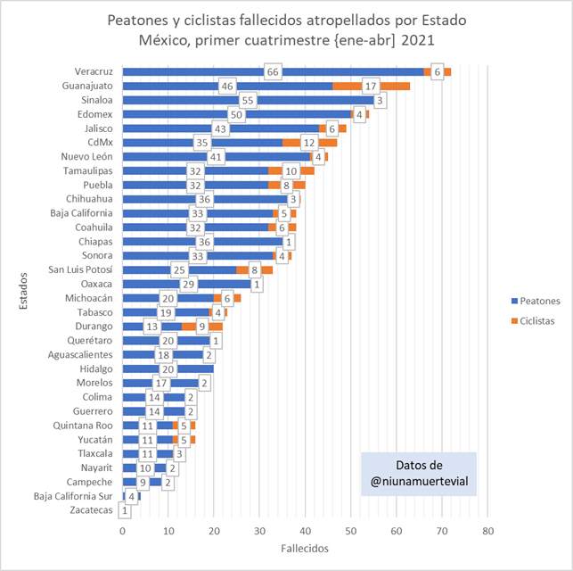 La cuenta refiere que los estados con más peatones fallecidos son: Veracruz con 66, Sinaloa con 55, Guanajuato con 46, Estado de México con 50 y Jalisco con 43. En Tamaulipas se contabilizaron 32 defunciones.