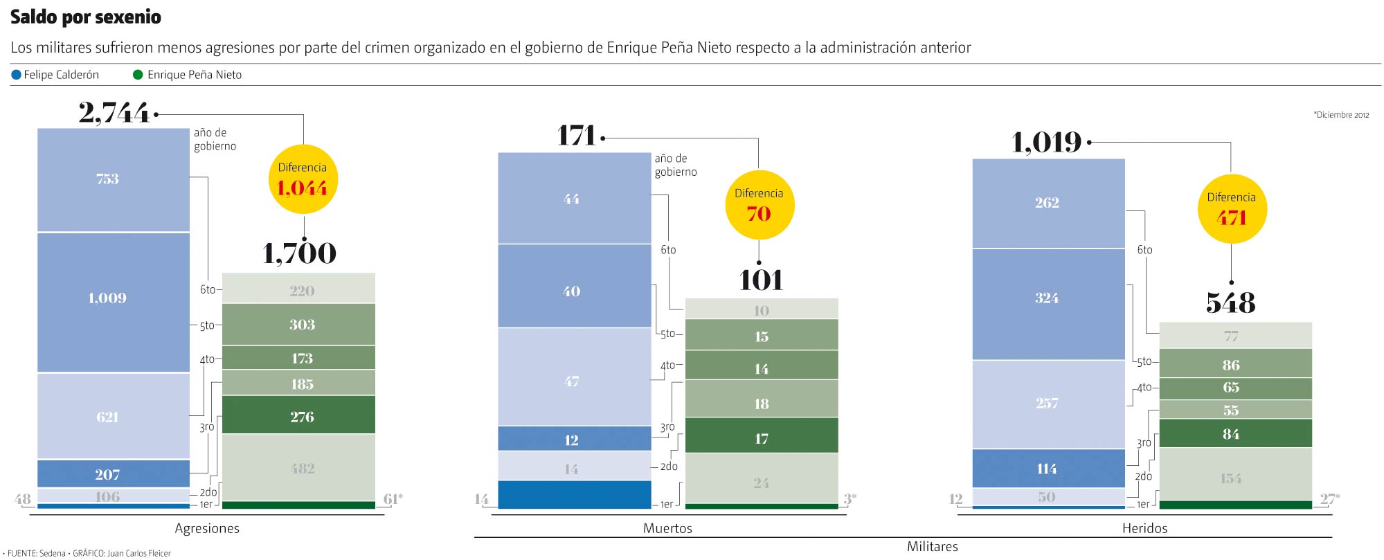 Sin embargo, las agresiones disminuyeron 61.9 por ciento en comparación con las 2 mil 744 del sexenio de Felipe Calderón, cuando se contabilizaron 2 mil 744 balaceras que dejaron 124 militares muertos y mil 19 heridos.