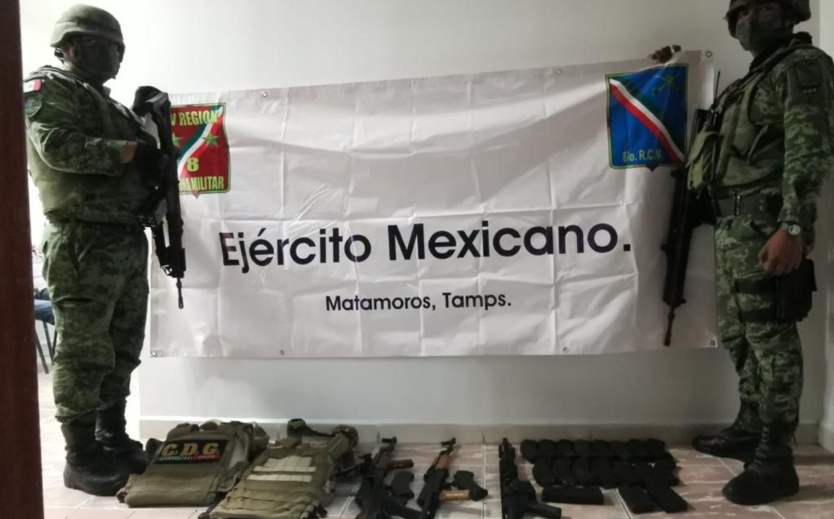 Personal del Ejército Mexicano rescató en Matamoros a cuatro civiles secuestrados, además aseguró cinco armas largas, cargadores y cartuchos, así como equipo táctico y una camioneta. No hubo detenidos.