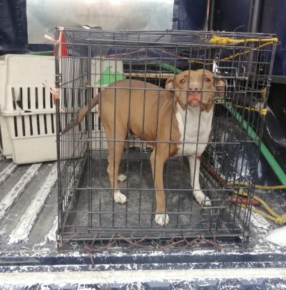 Integrantes de la Brigada de Vigilancia Animal llegaron para capturar a la hembra pitbull café para trasladarla a una clínica veterinaria en Tláhuac para su observación.
