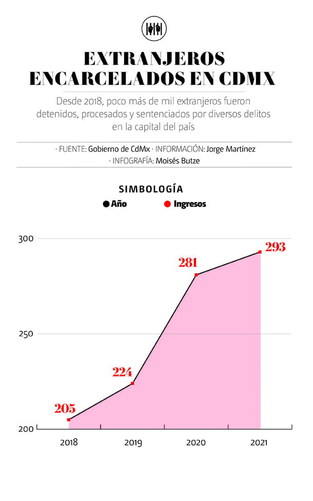De acuerdo con información obtenida por MILENIO vía transparencia, en 2018 ingresaron 205 reclusos extranjeros, para 2019 la cifra aumentó a 224, al año siguiente se elevó a 281 y en 2021 se cuantificaron 293. Las cifras oficiales marcan un crecimiento de 43 por ciento en este periodo.