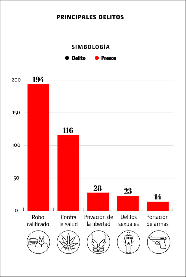 En 2019, 47 pisaron el reclusorio por robo calificado, 18 por homicidio, 21 por delitos contra la salud, nueve por agresiones sexuales, 11 por privación ilegal de la libertad, tres más por portación de armas de fuego, dos por delincuencia organizada, otro más por extorsión y nueve por diversos delitos.