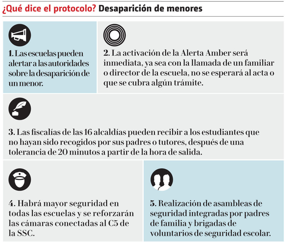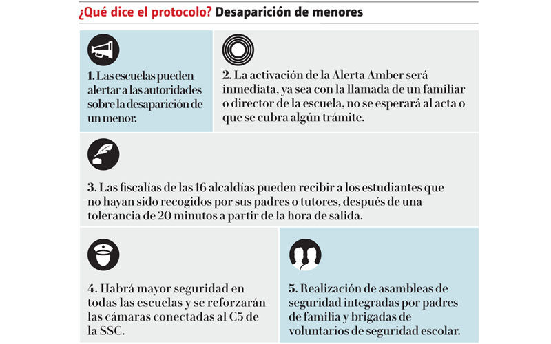 El titular de la Autoridad Educativa Federal en CdMx, Luis Humberto Fernández, informó el lunes que el protocolo Guía Operativa de las escuelas establece que un maestro es designado para recibir a los alumnos y entregarlos a sus padres, tutores o encargados de recogerlos a la salida y todos ellos deben de portar credencial vigente y autorizada. Pero en caso de que padres, tutores o encargados no lleguen tendrán que ser resguardados por el maestro encargado o el director de la institución y llamar a la autoridad para que el pequeño sea llevado a un Ministerio Público y ahí se haga contacto con la familia, pues en ningún momento pueden quedar solo en la calle.