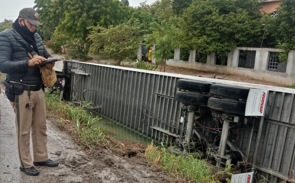 El susto de su vida se llevó el operador de un tráiler cargado con harina luego de volcar en la entrada al municipio de Xicoténcatl y caer a un dren de agua.