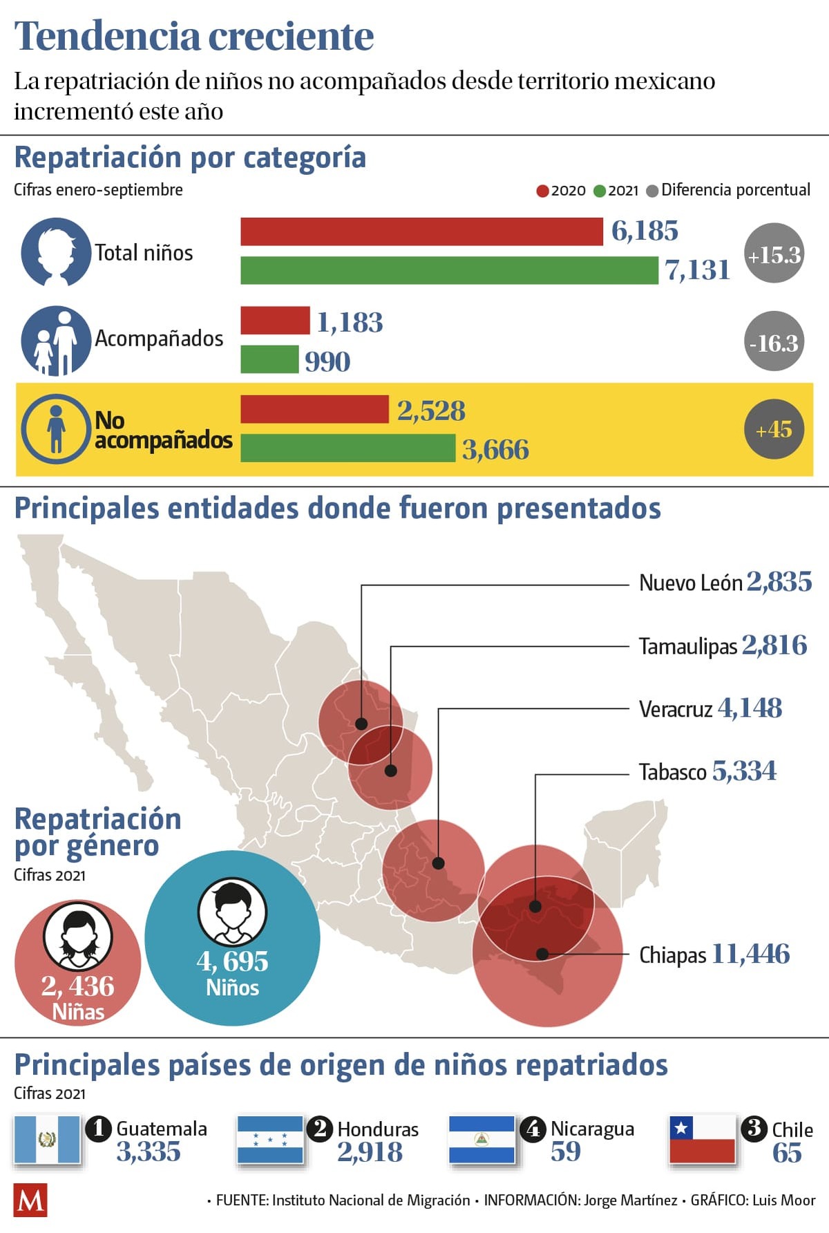 La cantidad de niños no acompañados que fueron retornados desde México a sus países de origen se incrementó 45 por ciento en el último año. De acuerdo con datos del Instituto Nacional de Migración (INM), la cifra de menores de edad que viajaban sin un adulto pasó de 2 mil 528 en los primeros nueve meses de 2020, a 3 mil 666 en el mismo periodo de este año.
