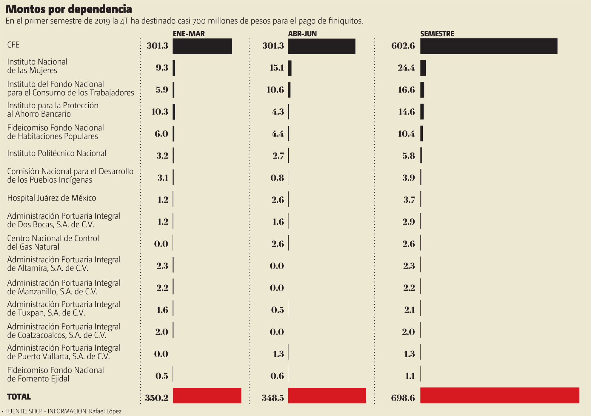 El gobierno federal ha gastado 698.6 millones de pesos en el pago de finiquitos durante el primer semestre de 2019; la cifra representa un incremento de 59.7 por ciento con respecto al mismo periodo del año anterior, de acuerdo con informes trimestrales de la Secretaría de Hacienda y Crédito Público (SHCP).