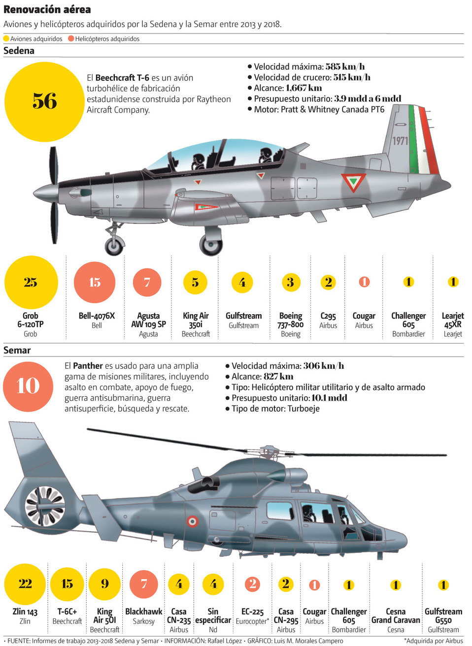 La mayoría de adquisiciones fue a la marca estadunidense Beechcraft con 56 aviones del modelo T-6C+ y otros 5 del King Air 350.
