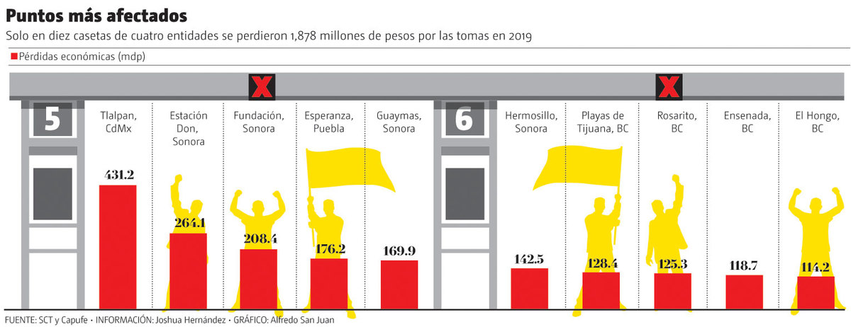 El mapeo de las 20 casetas con mayores pérdidas en 2019 identifica a cinco de Sonora; seguido por Baja California, con cuatro; Guerrero y Puebla, con tres cada una, y el Estado de México y Puebla, con dos, respectivamente; la lista también alcanza a Durango y a Ciudad de México.