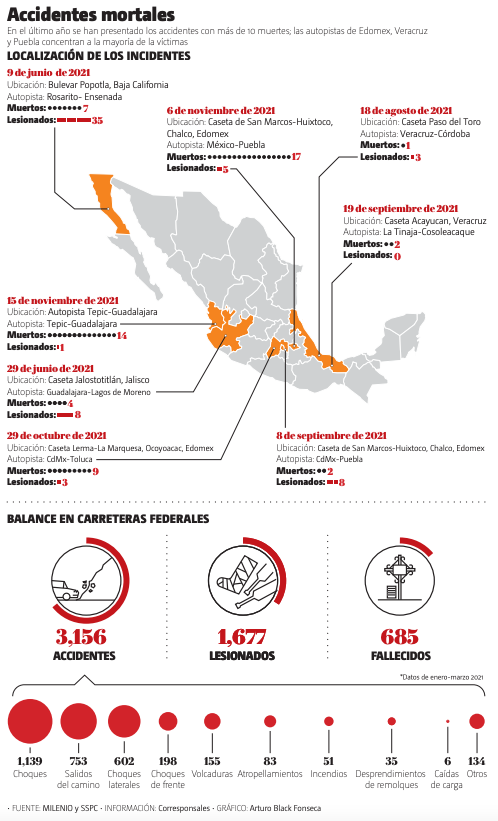En el último año, al menos 56 personas han muerto en ocho accidentes de tránsito ocurridos en casetas de peaje del Estado de México, Veracruz, Jalisco, Baja California y Nayarit, de acuerdo con autoridades federales.