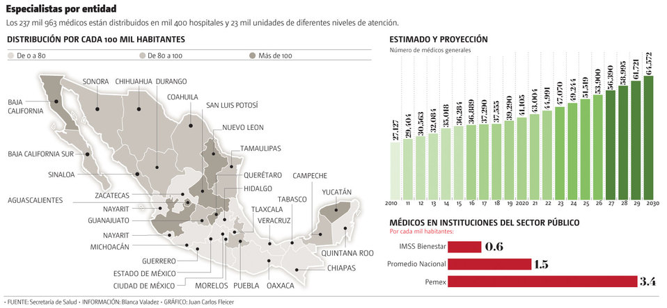 • De los 237 mil 963 médicos registrados en el país, en los hospitales de la Secretaría de Salud hay 1.8; en el IMSS, 1.3; en el Issste, 1.5; en Pemex, 3.4; en la Sedena, 2.2, y en Semar 3 (cifra por cada mil habitantes).