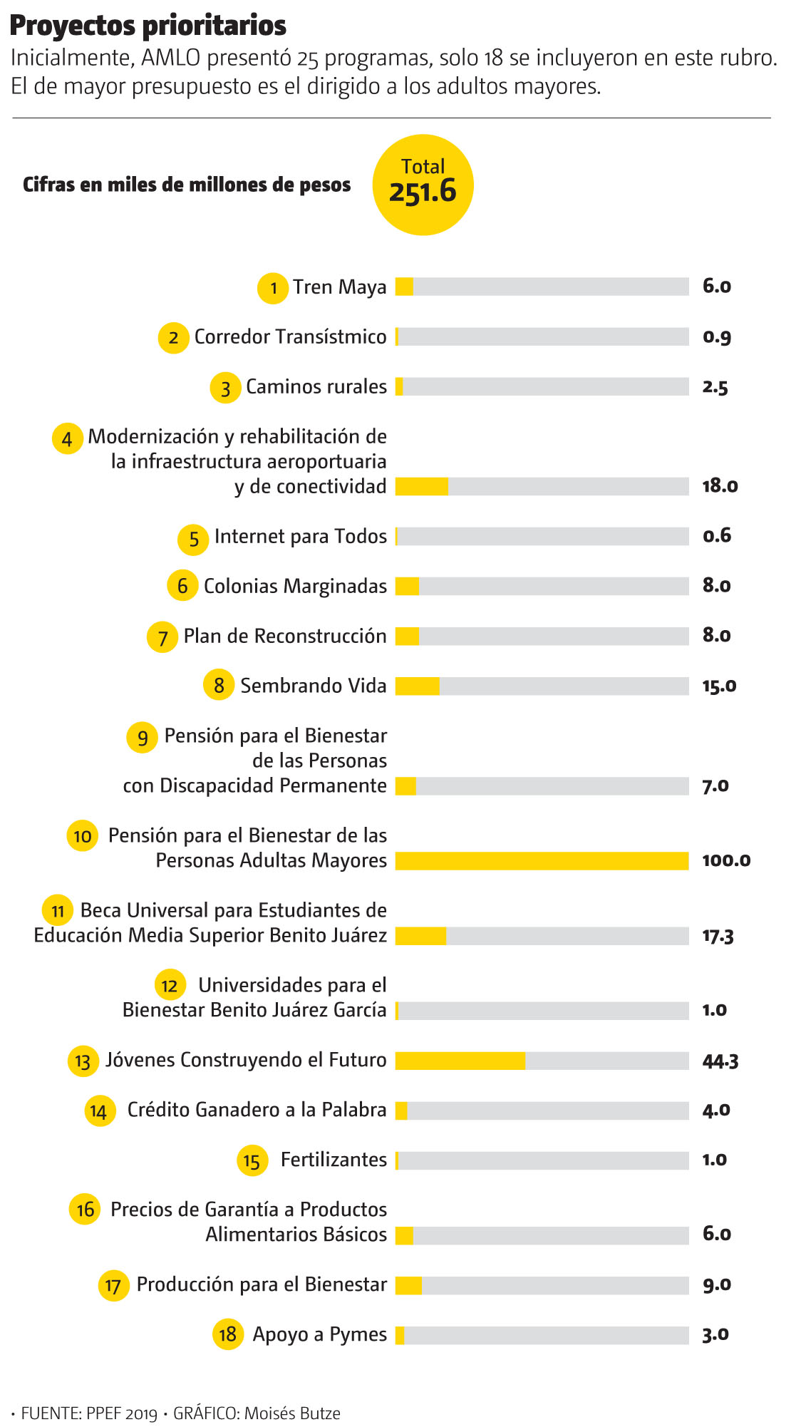 Aunque en el periodo de transición se había hablado en el gobierno electo de 25 programas prioritarios, en el presupuesto los grandes rubros que tendrán recursos prioritarios son 18, que incluyen el corredor transístmico, caminos rurales, el servicio gratuito de internet, presupuesto de infraestructura para colonias marginadas, la siembra de un millón de árboles, las universidades públicas, la beca para estudiantes, los créditos a la palabra y también los precios de garantía para productos básicos.