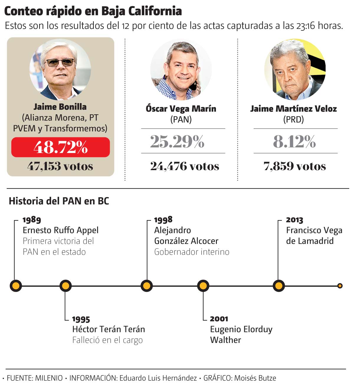 La coalición Juntos Haremos Historia conformada por Morena, PT, PVEM y Transformemos, arrebató la gubernatura de Baja California al PAN, quien gobernó la entidad los últimos 30 años. De acuerdo con el Conteo Rápido del Instituto Nacional Electoral (INE), el candidato morenista, Jaime Bonilla Valdez, aventaja con 48.72 por ciento de votos, al menos 20 puntos arriba de su competidor más cercano, el abanderado panista Óscar Vega Marín.
