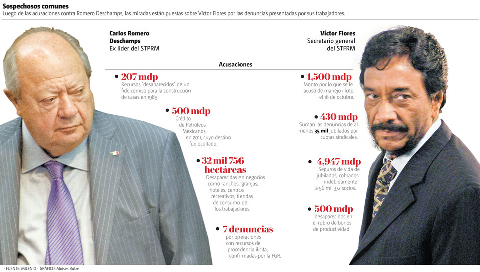 Lo acusan de fraude, delincuencia organizada, extorsión, enriquecimiento ilícito y lo que resulte; además, según el secretario general de la sección 31, con sede en Chihuahua, Benito Bueno Rentería, “más de 24 mil jubilados en la República presentan denuncias colectivas y piden acción penal contra Flores Morales y su Comité Ejecutivo Nacional”.