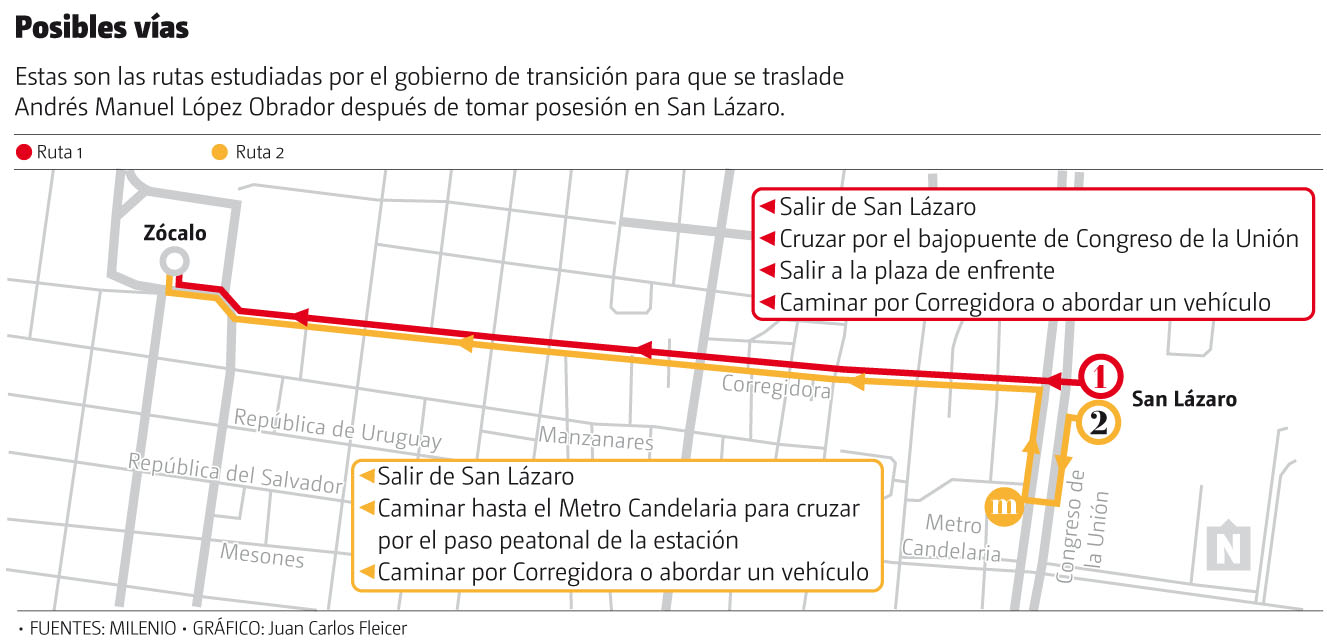 Después de su quinta reunión con el presidente de la Cámara de Diputados, Porfirio Muñoz Ledo, para afinar los detalles de la toma de protesta, el equipo de López Obrador salió del recinto parlamentario y cruzó la avenida Congreso de la Unión por el llamado bajopuente frente a San Lázaro y regresó por esa misma vía a las puertas del recinto, para después repetir el ejercicio, pero por el paso peatonal de la estación Candelaria del Metro.