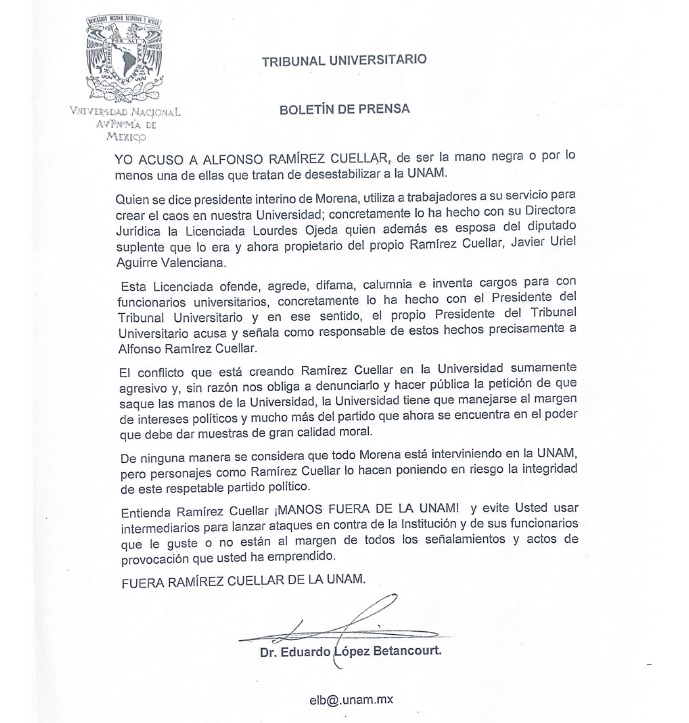 El presidente del Tribunal Universitario, Eduardo López Betancourt, acusó a Alfonso Ramírez Cuéllar, presidente interino de Morena de ser la "mano negra" que intenta desestabilizar a la Universidad Nacional Autónoma de México (UNAM); sin embargo, la casa de estudios desconoció el documento dado a conocer.