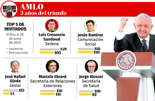 La lista de los 10 más asiduos asistentes a las conferencias del Presidente, la cierran la secretaria de Gobernación, Olga Sánchez; la secretaria de Educación, Delfina Gómez, el director del IMSS, Zoé Robledo, y el comandante de la Guardia Nacional, Luis Rodríguez Bucio.