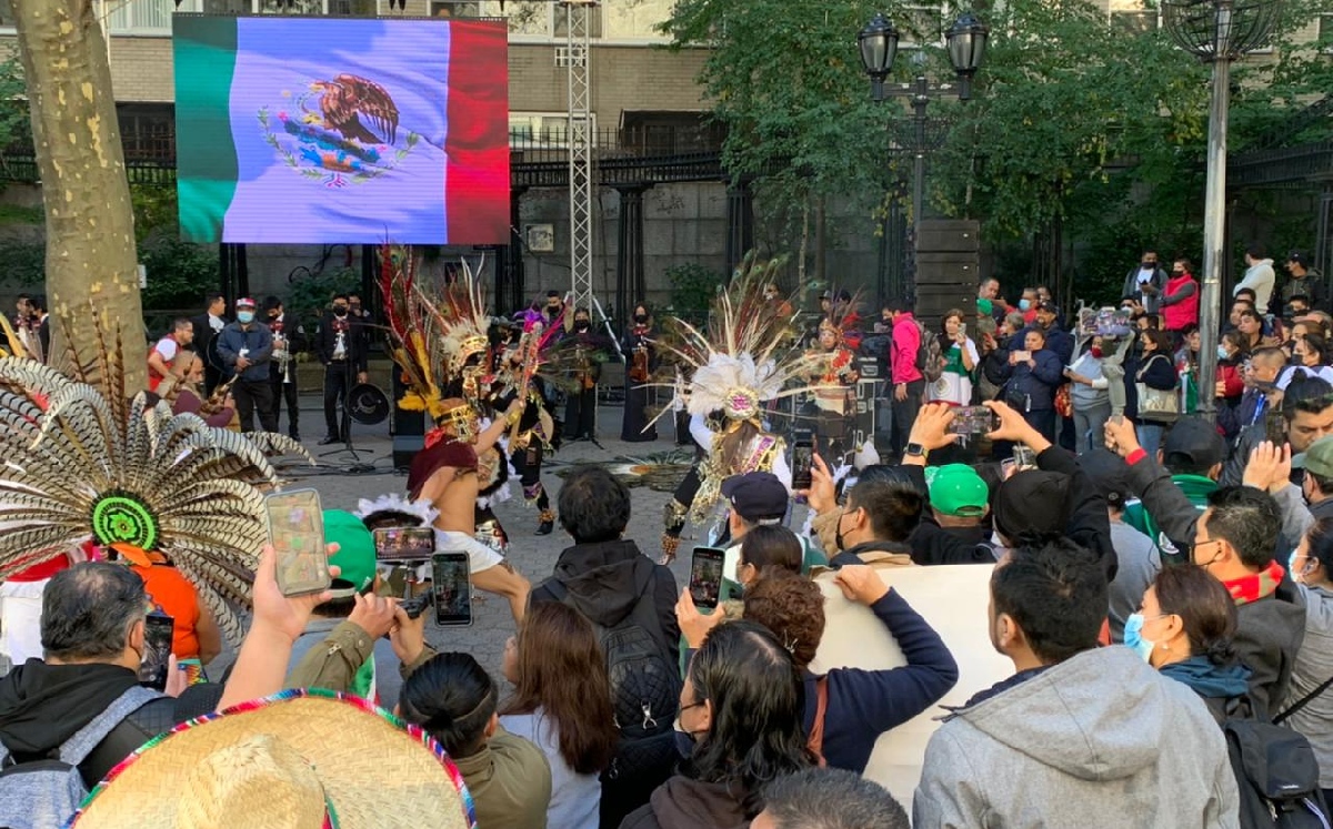 Un grupo de mexicanos se congregaron en el parque frente a la sede de las Naciones Unidas en Nueva York para celebrar la visita del mandatario. Con altavoces, mariachi y hasta danzas tradicionales prehispánicas, los migrantes se reunieron para observar el discurso que dará el Presidente ante el Consejo de Seguridad.