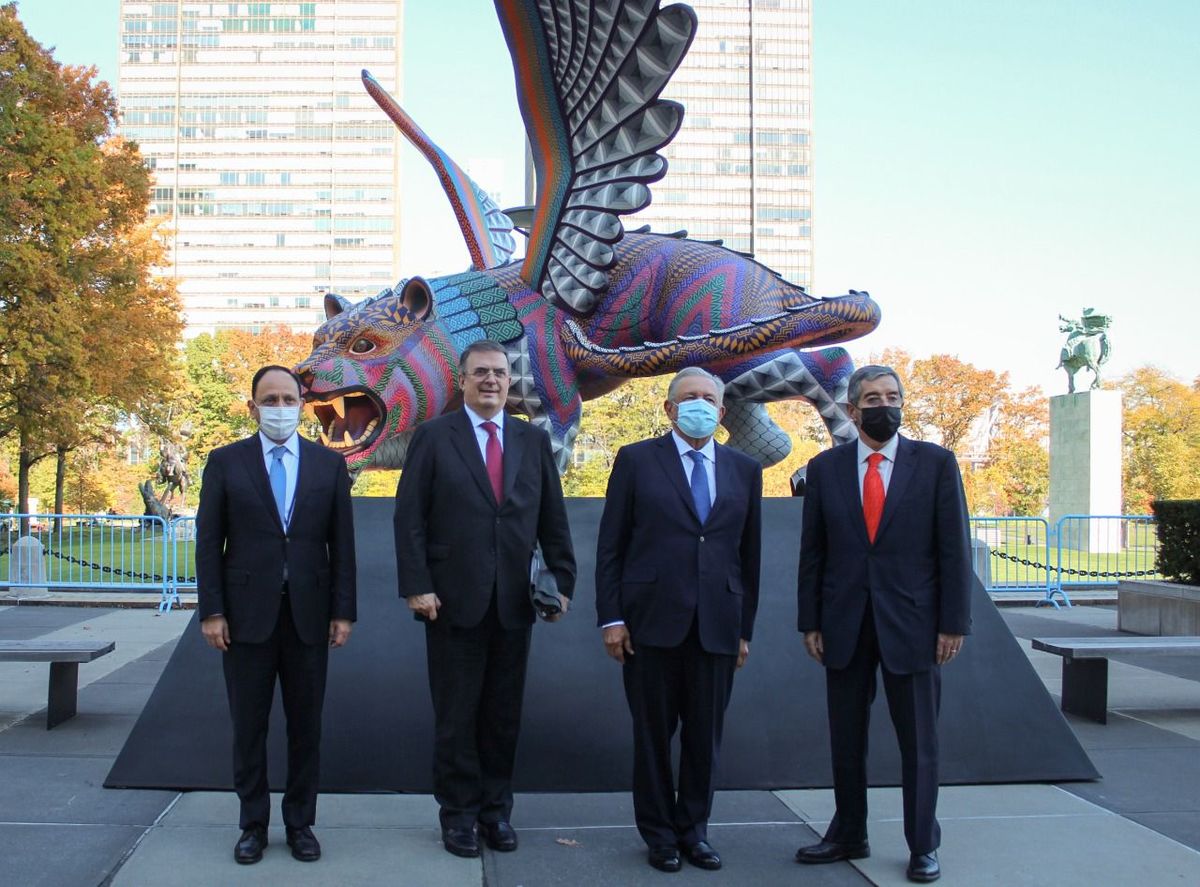 En conjunto con el canciller y el representante permanente de México ante la ONU, el mandatario posó frente al Guardián de la Paz y la Libertad Internacional, un alebrije realizado por artesanos zapotecas que llegó a Nueva York el 4 de noviembre, como regalo del gobernador de Oaxaca, Alejandro Murat.