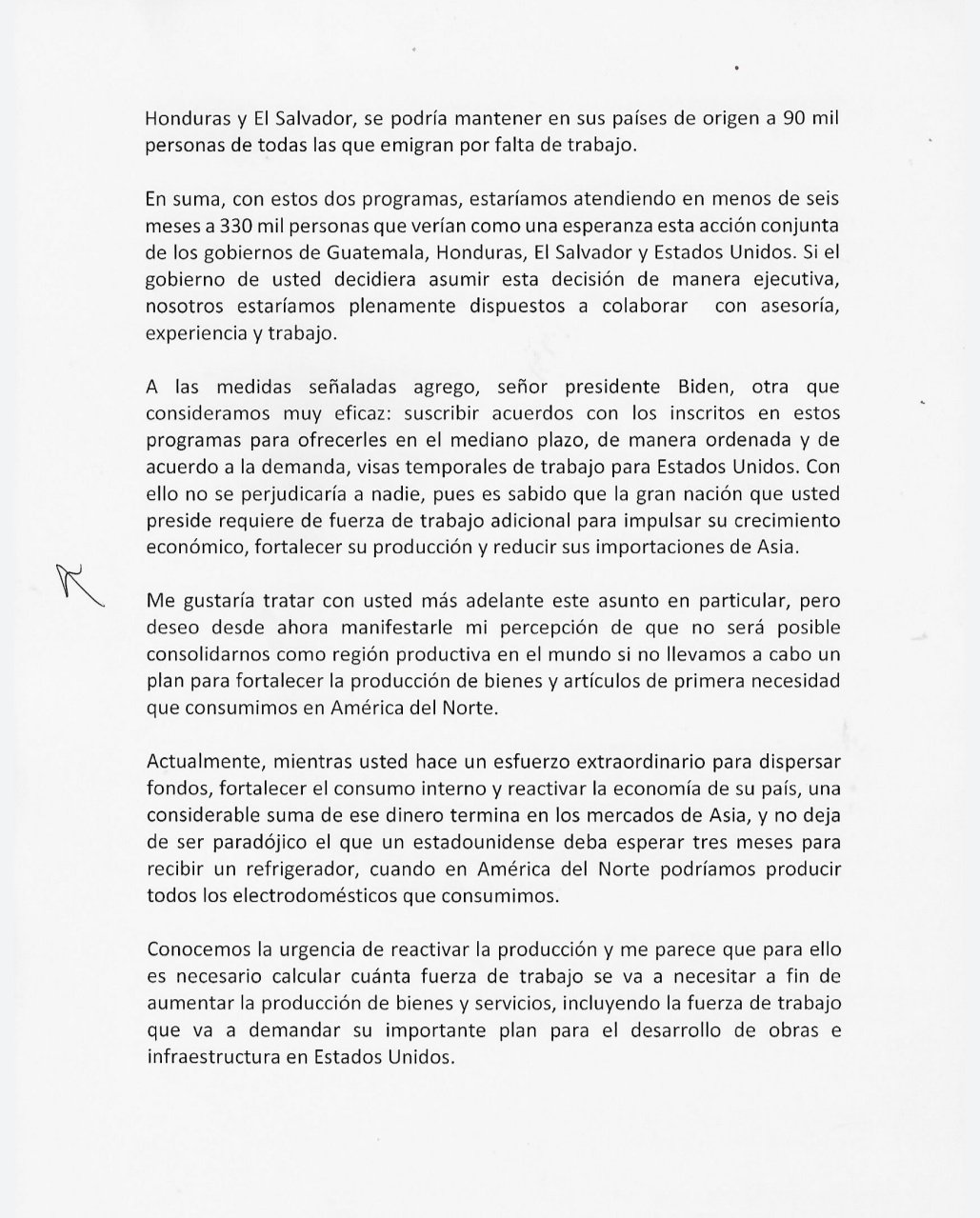 Asimismo, le pide aplicar de inmediato en los tres países centroamericanos de mayor migración los programas Sembrando Vida y Jóvenes Construyendo el Futuro. "Si está acción se aplicara de inmediato en Guatemala Honduras y el Salvador se podrían mantener en sus países a 90 mil personas de todas las que emigran por falta de trabajo", resalta.